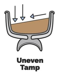 وجود ناحیهی بدون تمپ اطراف لبهی بسکت باعث میشود آب آسانتر از کنارهها عبور کند. بسیاری از تمپرها فقط ۵۸ میلیمتر عرض دارند (یا حتی باریکتر)، در حالی که عرض استاندارد بسکتها بهطور میانگین ۵۸.۷ میلیمتر است. این اختلاف ۰.۷ میلیمتری معادل حدود ۶۴ میلیمتر مربع سطح بدون تمپ است. وقتی لبههای تمپر هم خمیده یا پخ باشند، این سطح بیشتر هم میشود. استفاده از تمپر پهنتر با لبههای صاف و تیز سطح تمپشدهی پَک را به حداکثر میرساند.